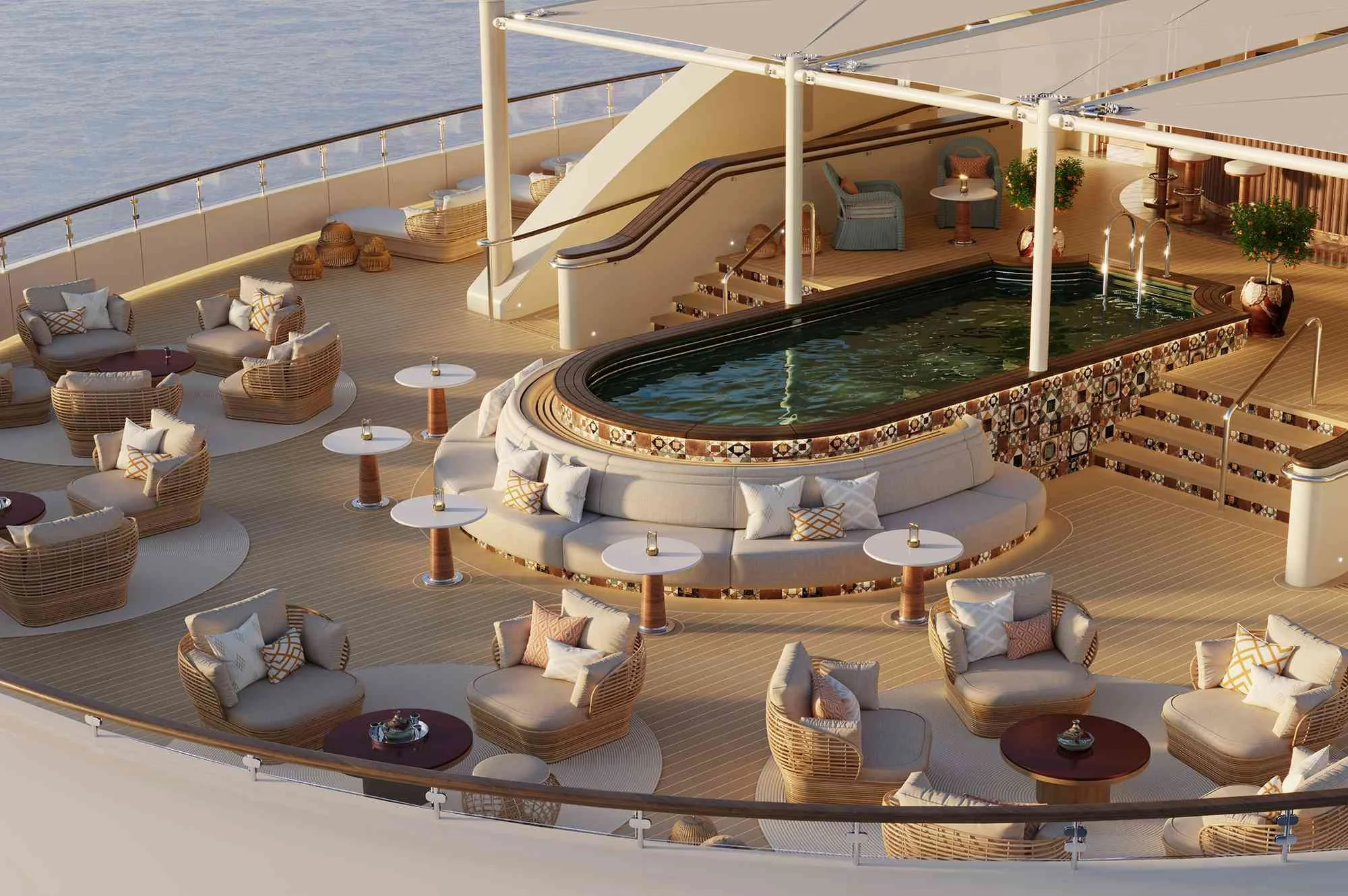 The on-board spa and wellness center will offer everything from sunrise yoga to bespoke facials, massages, and immersive wellness programming. You'll also find a state-of-the-art fitness center, steam rooms, and a serene indoor-outdoor relaxation area. For leisure, enjoy multiple pools, including a 66-foot saltwater pool at the yacht’s stern with panoramic views of the sea.